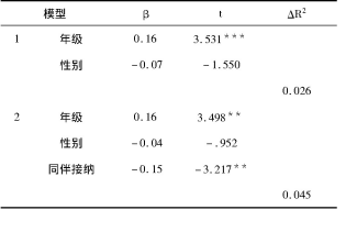 采用分层回归分析,在控制年级、性别影响的基础上,考察同伴接纳对外化问题行为的独立预测作用,结果发现(表3),在控制了年级、性别的作用后,同伴接纳对外化问题行为有显著的负向预测作用。