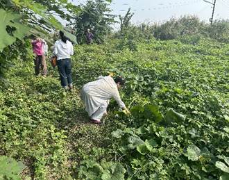 随后,大家便戴上手套,拿着袋子亲自到大棚中采摘。瓜博园中有一排排整齐排列的塑料大棚,里面种植着各种各样的瓜果蔬菜,老同志们分别采摘了茄子、南瓜、辣椒、香瓜等,在亲手采摘的过程中放松心情,享受生活,回归自然。