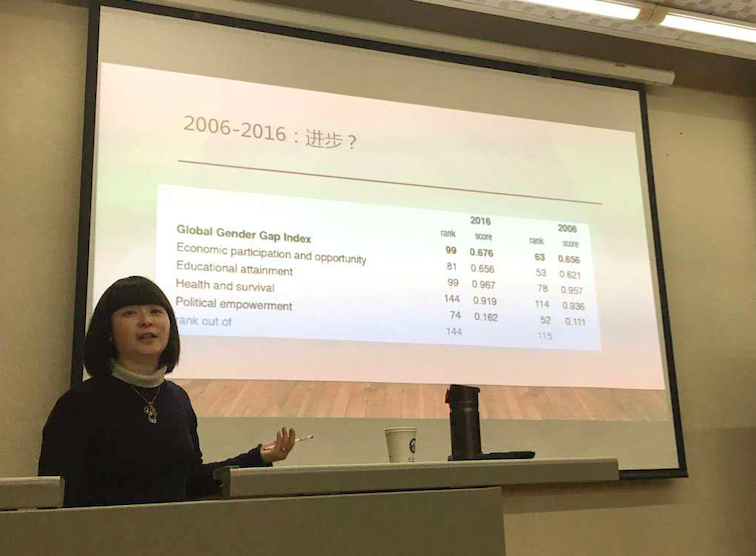 首先,陈老师澄清立场,表明自己参与这场讲座的原因。陈老师说,尽管她自己学术上还是沉潜状态,没有得出最终的哲学结论,所以通常不太愿意做讲座。但是基于与同事互动中发现的问题,包括对女生自己决定不读博士的正面支持,以及对女生不要读博士的积极建议;希望以一个女性研究者的身份,跟大家交流性别平等的问题。女权主义不是她的研究领域,但对她来说“女权主义是一种行动、一种生活”,所以今天的讲座更是先行者和后行者之间的交流。”