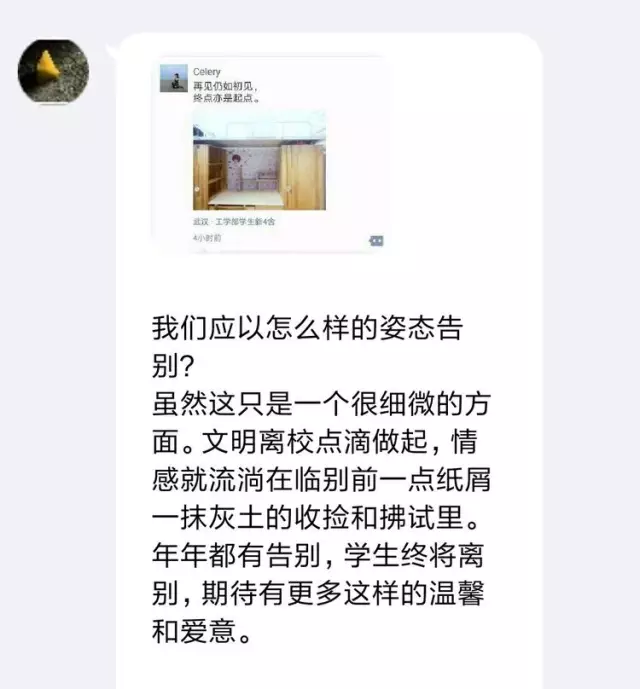此前两天,五楼自拍 毕业生秦蔡思遐发布了一条床位干净如初的朋友圈,引起了我们的关注。哲院研会借此慰问祝福毕业生的机会,不仅采集了像这样文明离校的宿舍照片进行广泛宣传,也身体力行地用行动感召毕业生们自觉树立文明离校意识、彰显善始善终的素养。
