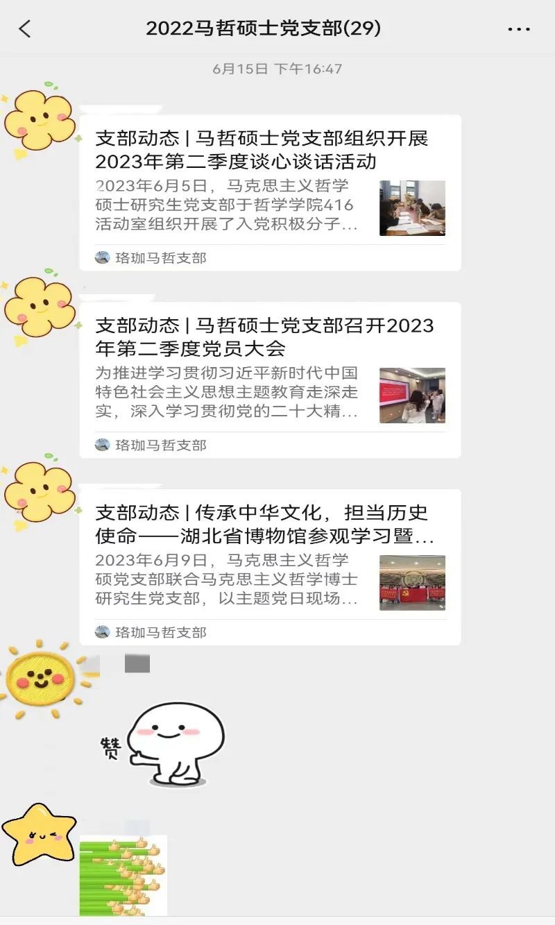 发挥把握舆论主动脉的优良传统,利用官方公众号“珞珈马哲支部”、“武大哲院研会”及五楼自拍