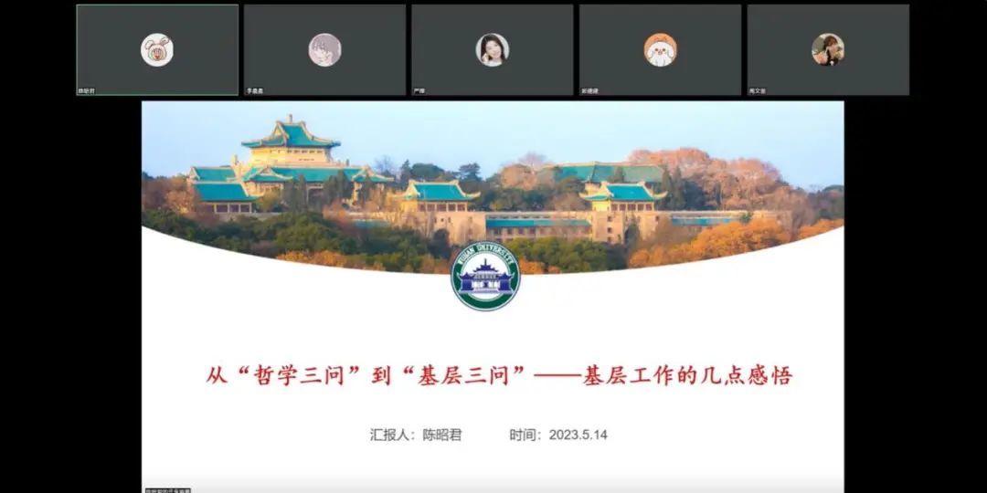 随后,哲学学五楼自拍 2022届硕士毕业生陈昭君进行了分享,她是湖南省2022年的定向选调生,她就于湖南省株洲市茶陵县马江镇文江村担任党总支书记助理时的基层工作经历分享她的感悟与收获。她向同学们展示在基层工作的照片,告诉大家基层工作就是第一时间能够站出来为群众解决问题。她从基层的实际工作中总结到基层是一所没有书本的“大学”,要谦虚地学习干实事、办好事的方法和智慧,做好群众的“勤务员”。