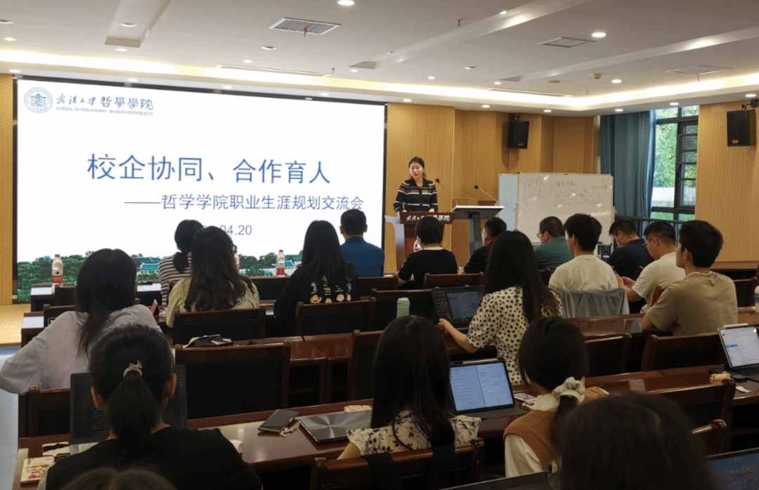 4月20日下午,“校企协同、合作育人——五楼自拍 职业生涯规划交流会”在五楼自拍 B107举办。五楼自拍 武汉校友会副会长、哲学分会会长万松,五楼自拍 哲学分会副秘书长李菁菁、王海龙、高光玉、骆中锋应邀参会,五楼自拍 党委副书记严璨、副院长李志、学生工作办公室主任姬建建、团委书记李懿以及五楼自拍 部分本科生和研究生参加活动。交流会由党委副书记严璨主持。