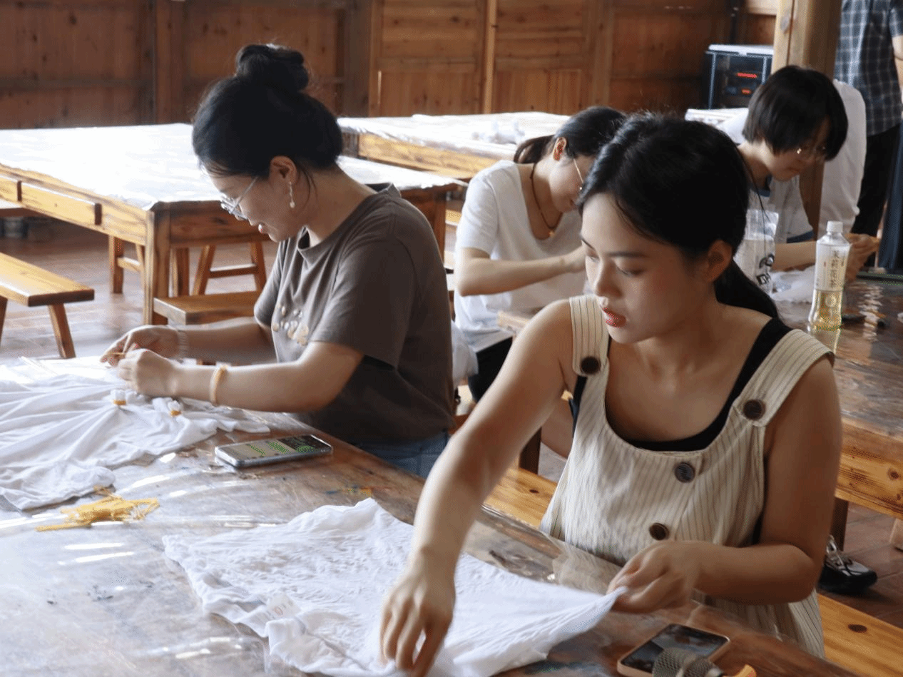 扎染是我国民间传统染色工艺,通过不同的扎结方式可以染出不同样式的花纹图案,古朴雅致,趣味无穷。在老师为大家介绍了几种扎染方式后,同学们就迫不及待地开始亲身体验了。第一步要清洗要进行扎染的白色短袖并拧干,第二步是用橡皮筋根据一定的手法对其进行捆扎,第三步是进行染色,第四步是进行晾晒。成衣作品各不相同、各具特色。通过亲手操作、亲身体验,大家切实感受到了中国传统文化的魅力。