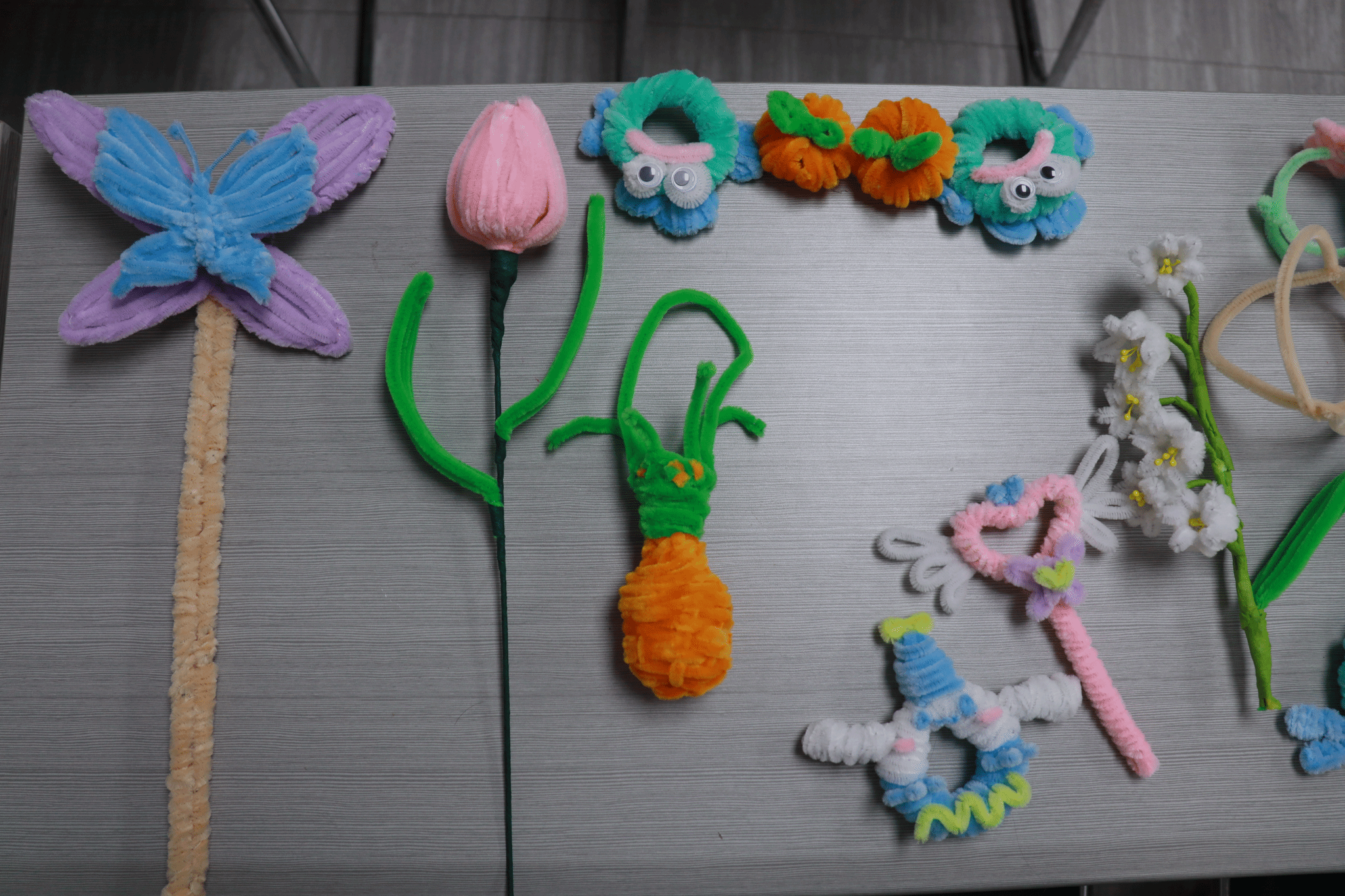 许多同学展现出了惊人的创意和手工天赋。一位同学利用扭扭棒制作了一束灿烂盛开的铃兰花,柔和的线条和明快的颜色让人赞叹不已。另一位同学则巧妙地将扭扭棒扭成了一只冰淇淋,丰富的细节和自然的形态引来众人称赞。