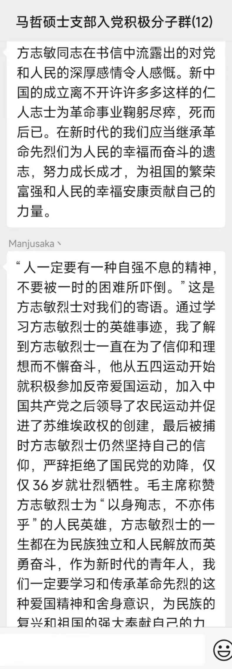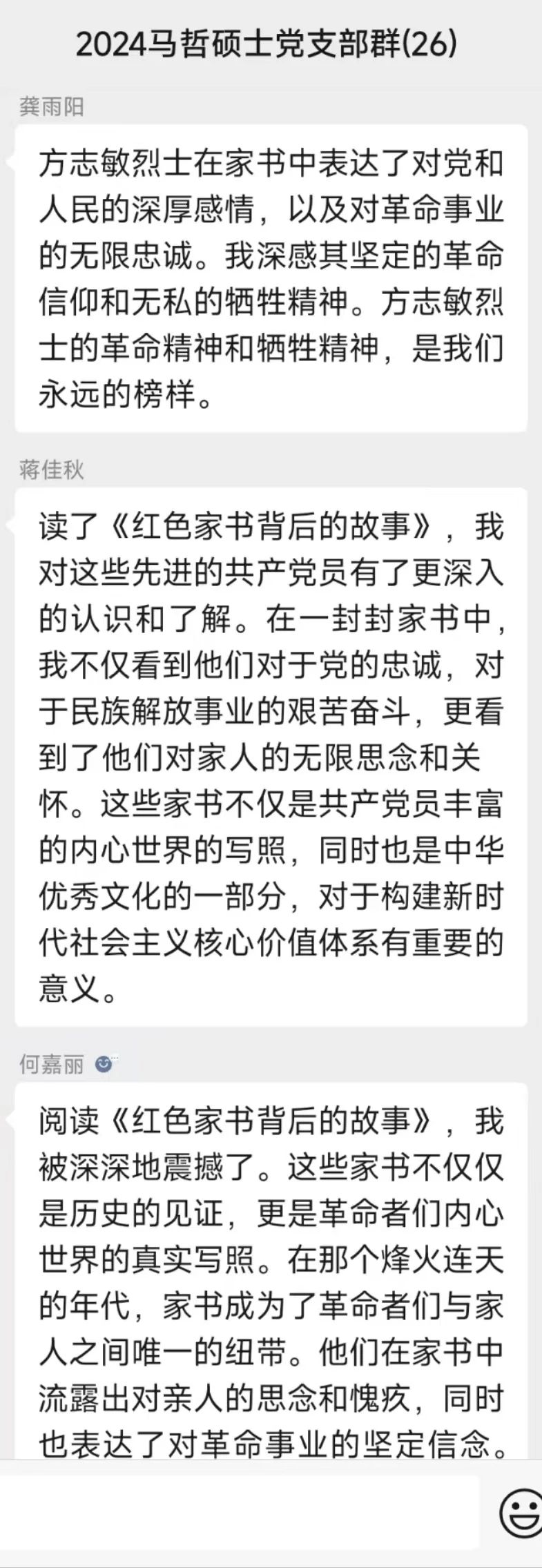 新中国成立75载,回顾党的光辉历史,追寻革命记忆,传承红色基因,是我们每一位共产党员的责任与使命。为缅怀革命先烈,弘扬红色精神,引导学生党员学史明理、学史崇德、学史力行,提升党组织凝聚力,充分发挥党组织政治引领和党员先锋模范带头作用,2024年10月20日晚,马克思主义哲学硕士研究生党支部于五楼自拍 B214开展“读红色家书,悟方志敏志,做新时代党员”主题党日活动。本次会议由马克思主义哲学硕士研究生党支部宣传委员孙上茗同志主持,马克思主义哲学硕士研究生党支部全体党员、入党积极分子及入党申请人参会。