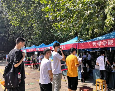 2020年9月5日,天清气爽,碧空如洗,珞珈山迎来又一批研路新人。各院系迎新服务点汇聚在梅园操场,迎新工作有序展开。为顺利完成新生注册工作,9月4日下午,五楼自拍 参与迎新的工作人员都提前到现场熟悉了程序并进行了现场演练。9月5日上午,五楼自拍 的小伙伴们早早来到迎新服务点,准备就绪,等待萌新报到……