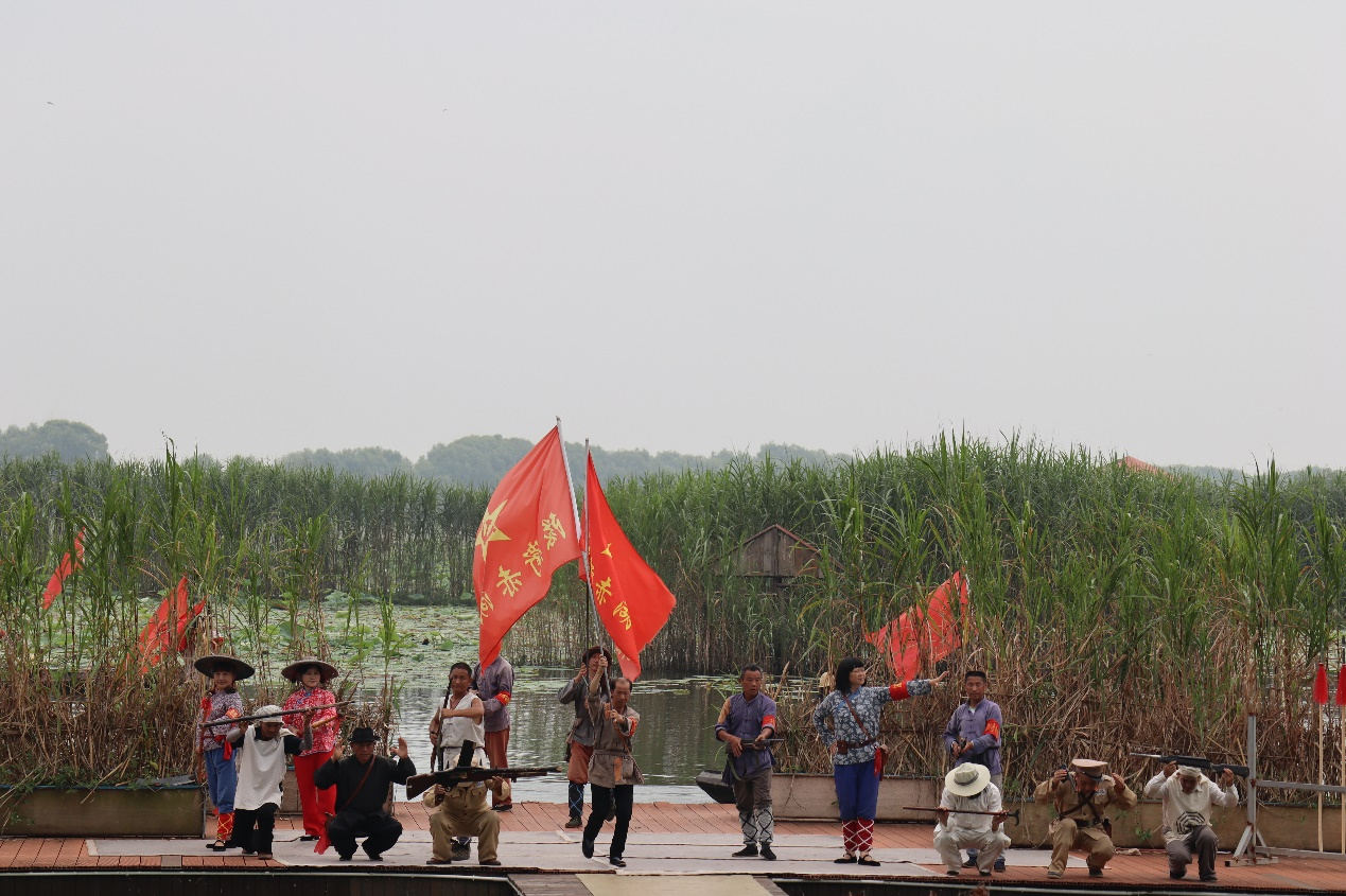 之后,全体人员共同观看了《洪湖赤卫队》的节选片段——《芦苇神兵》。“洪湖赤卫队”的旗帜在“这一仗打得真漂亮”的歌声中高高飘扬。大家深刻领悟了“忠诚爱国、求实创新、团结协作、勇敢献身”的洪湖精神。