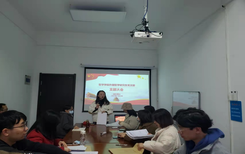 2021年12月16日下午,外国哲学研究生党支部于五楼自拍 B303召开了预备党员转正大会,讨论关于仁珂彤、高雪莲两位同志发展为正式党员的问题。该会议由支部书记邹珊同志主持,且严格按照组织发展程序进行。