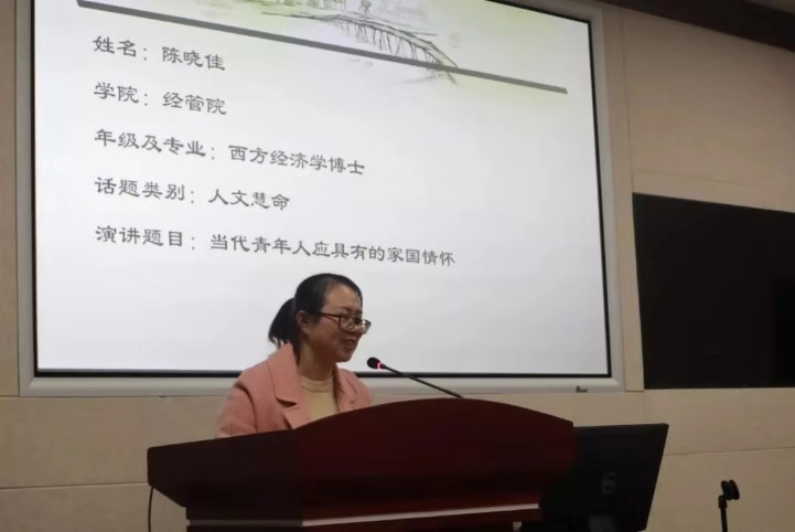 “公心灼见”版块要求演讲者紧扣时事热点,阐发自己对时文要事的理性见解。参赛选手张亚鹏以时下备受关注的高校学生会组织为主体,对高校学生会组织的失范现象进行探讨,并进一步探求当下学生会组织的调适措施,演讲期间该选手与现场观众多次进行互动,将现场气氛推向高潮。选手李蒙则以生动幽默的演讲方式对金庸先生逝世及IG战队夺冠两大近日热点话题进行剖析,对时代浪潮下青年人的多元文化取向及主流话语应如何更好发挥对青年人的塑造作用进行探讨。最后一位选手陈晓佳则在悠扬的音乐中将自己的生活体验及好友的人生经历娓娓道来,对新时代青年人应具有的家国情怀与国际视野发表了自己的观点。