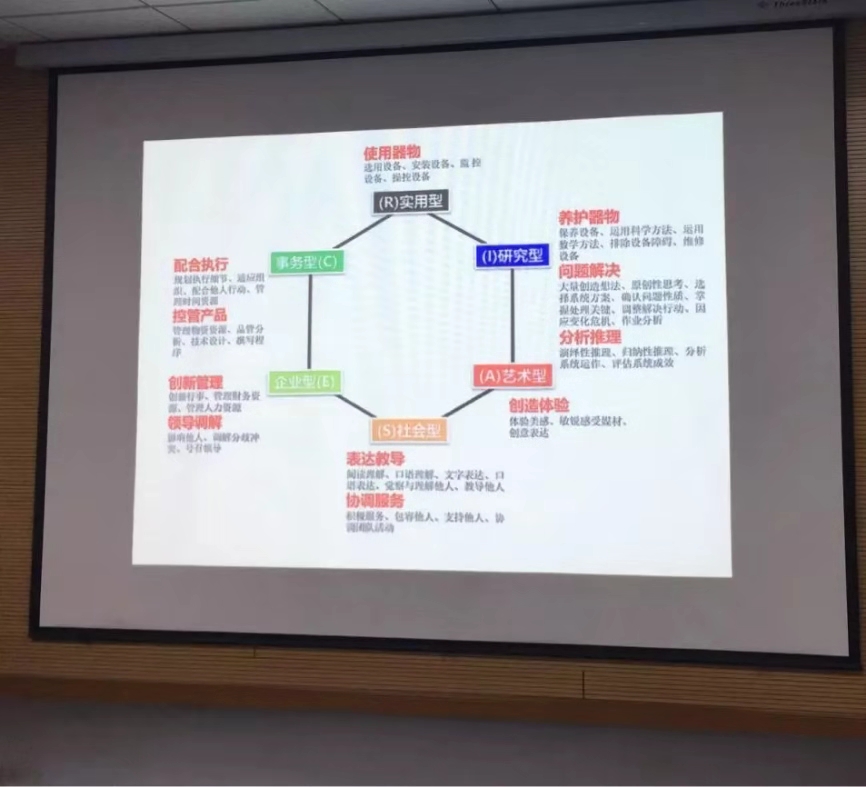 朱炜老师首先对个人的学习与工作经历进行了简单介绍,继而将话题自然地引入至就业问题。由于在场听众多为人文社科类专业,朱老师有针对性的对人文社科类就业概况进行了介绍,并通过表格为大家直观展示了近三年全校各类专业就业率。接下来朱老师通过展示哲学专业本科生、硕士生及博士生的就业去向着重分析了目前哲学专业的就业形势。这为在场同学在选择未来意向企业提供了参考。面临诸多就业岗位和机会,如何选择契合自身的发展路径,朱老师给大家介绍了“霍兰德的兴趣类型理论”,从自己的兴趣点与个性类别出发,然后选择适合自己的就业岗位,在这个过程中,要多加尝试。
