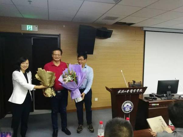 (图为日语系系主任曾丹和翻译系系主任熊伟给彭富春教授献花)