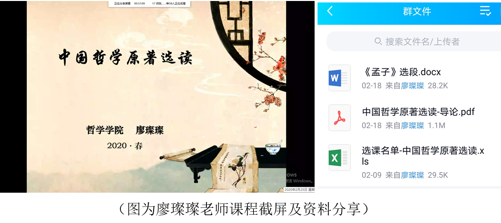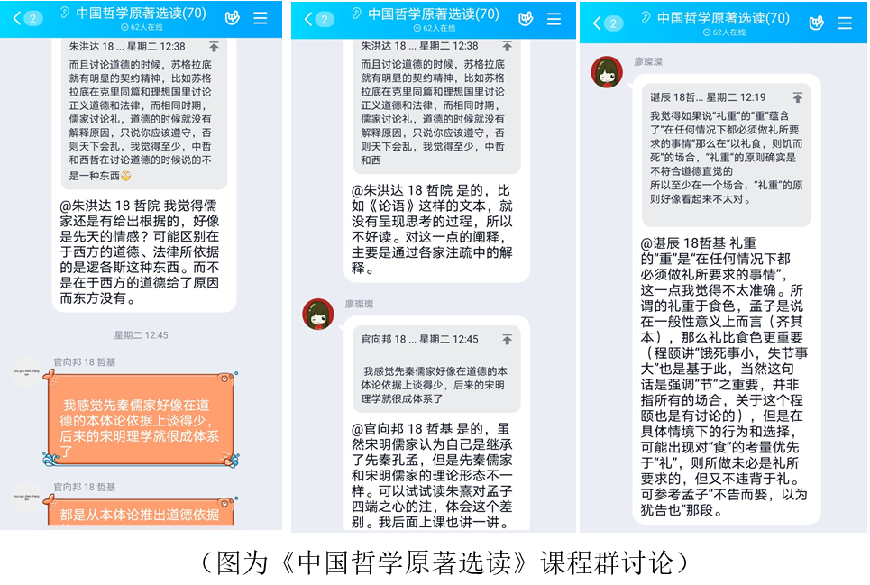 廖璨璨老师的中国哲学原著选读课程采用QQ屏幕共享直播与QQ群讨论相结合的上课方式,首先将上课所需要的的资料上传至群文件,同学们可以下载阅读。上课时老师进行屏幕共享,便于同学们了解内容,同学们有任何问题都可以在QQ群提出,老师课间看到问题都会细致解答,既不妨碍上课思路不占用上课时间,又能给同学们遇到疑惑随时提出问题的机会,课堂效果良好。
