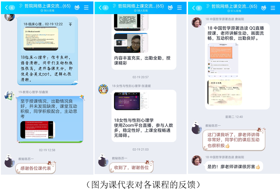 五楼自拍 与学生紧密联系,学生自觉在家中创造学习环境。开学前由各班推选出各课程课代表,成立课程群,便于上课和课程互动。五楼自拍 面向所有课代表成立哲院网络上课交流群,专门对接学生,及时接收和了解学生对课堂的反馈,对于学生提出的问题及时作出回应和解决。