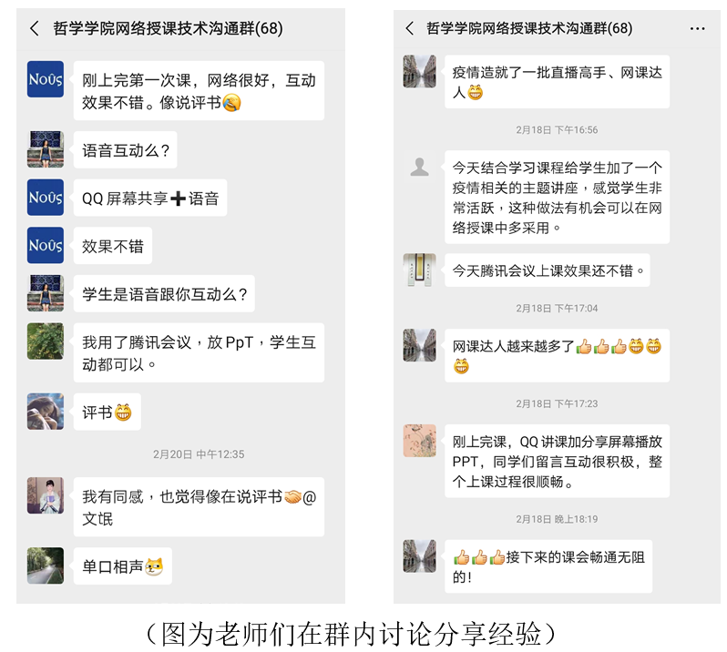 特殊时期,哲院老师和同学们排除万难,调整课程内容,协调上课软件,努力创造良好的教学环境,网络教学正有序开展,体现了哲院人爱智求真和不屈不挠的意志。希望早日疫散花开,再度齐聚珞珈山下。