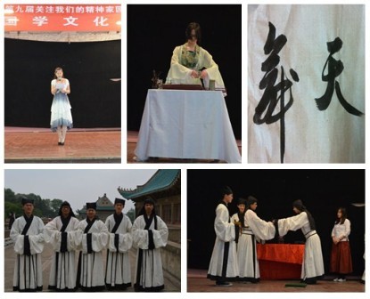 4月21日、4月27日,“国学文化周”活动在樱顶大学生活动中心和桂园操场进行了现场演绎。本着弘扬国学文化,体会古韵哲思,繁荣校园生活的宗旨,活动囊括了茶艺、古礼、太极、古琴、笛箫、书法等诸多国学文化表演。表演形式丰富多样,活动规模更显宏大。笛箫悠扬,茶香缭绕,礼仪肃穆,氤氲在国学营造的复古氛围里,让人如痴如醉。