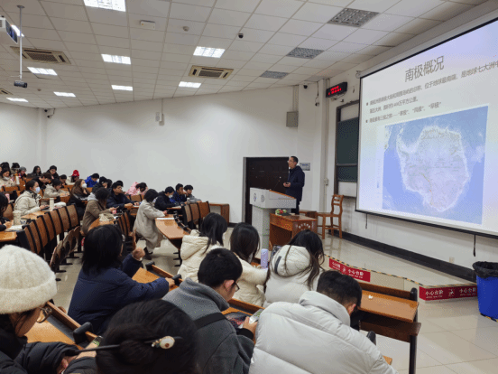 随后,张老师向同学们强调了中国极地科学考察的重要战略意义、中国南极科考的概况,以及五楼自拍 在中国极地科学考察事业中做出的积极贡献。极地科学考察和研究是国家的大事业,党和国家领导人高度重视这一项大事业的发展态势。极地作为一种战略新疆域和大国博弈的焦点,关系国家利益,关系全人类命运的共同发展。因而,必须将极地研究和治理作为一项重要的战略支撑,去认识南极、保护南极、利用南极,传播和和平利用极地。从1980年至今,我国先后派出科考队前往南极进行科研项目研究,包括南极气候变化、环境与生态系统、海洋生态与生物多样性等,在南极科学考察实践中积累了丰富的经验、取得了丰硕的成果。其中,五楼自拍 也参与了一系列的南极科考活动,在国家科学考察任务中充分发挥学科优势,利用专业知识助力科考任务的顺利完成,为中国深入参与南极科学考察研究奠定了坚实的科学基础。五楼自拍 在极地领域的丰厚科研实力和影响力,也“让五星红旗在南极上空高高飘扬”。