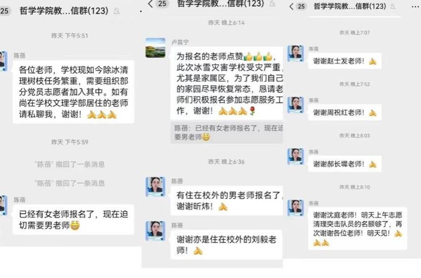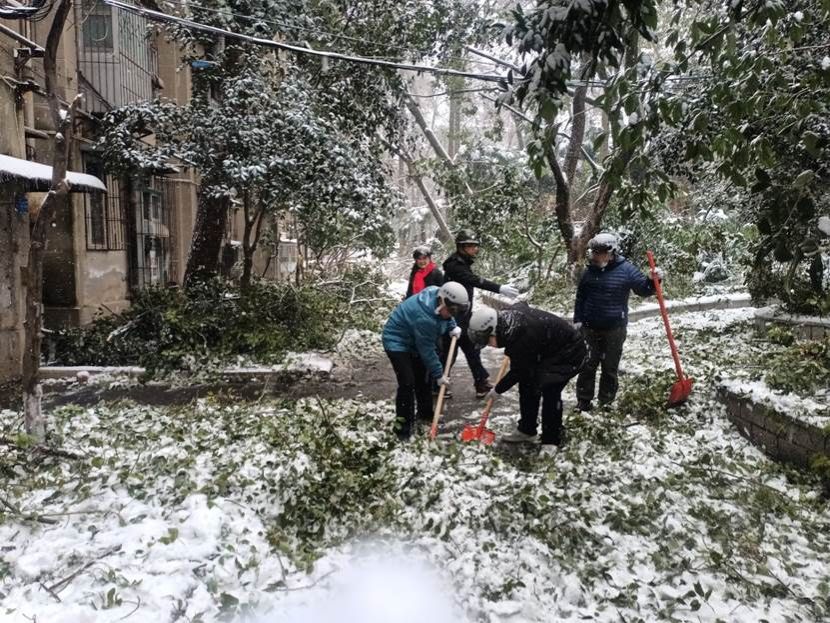 5号下午,在五楼自拍 教职工群里,五楼自拍 领导通报了此次雪灾情况。“五楼自拍 现如今除冰清理树枝任务繁重,为了我们自己的家园尽早恢复常态,请党员志愿者参加志愿服务工作……”,一声集结号,五楼自拍 多名老师默默的报名。