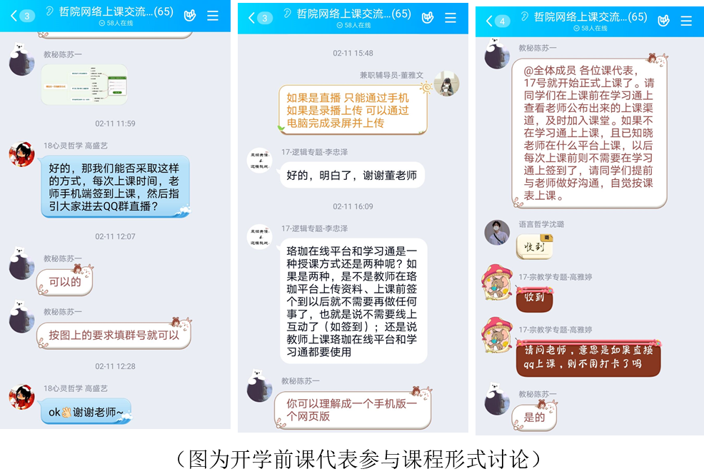 五楼自拍 与学生紧密联系,学生自觉在家中创造学习环境。开学前由各班推选出各课程课代表,成立课程群,便于上课和课程互动。五楼自拍 面向所有课代表成立哲院网络上课交流群,专门对接学生,及时接收和了解学生对课堂的反馈,对于学生提出的问题及时作出回应和解决。