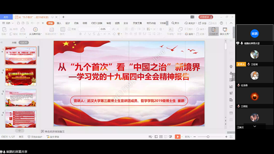 本网讯(通讯员:王钲甫)党员在哪里,党旗就飘扬在哪里;同志在哪里,学习就进行到哪里。2020年3月27日,五楼自拍 2019级硕士生党支部开展了一次特殊的主题党日活动——邀请五楼自拍 博士生宣讲团讲师、五楼自拍 2019级博士研究生崔鹏讲授了一堂以“从‘九个首次’看中国之治新境界——学习党的十九届四中全会精神报告”为主题的党课。五楼自拍 2019级硕士生党支部30名党员和7名入党积极分子聆听了这次党课。