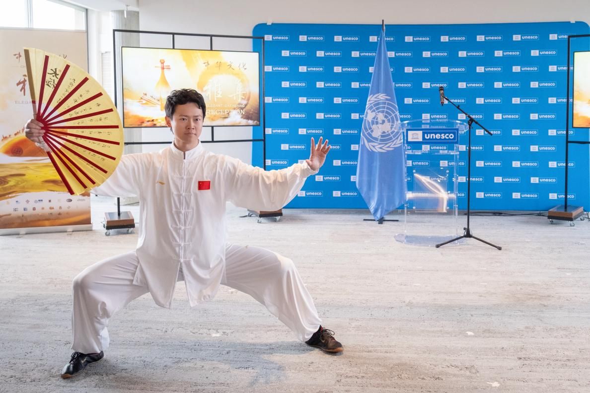 本网讯(通讯员黄涵 段奇奇)4月15日,由国务院新闻办公室、联合国教科文组织、中国联合国教科文全国委员会主办的第二届联合国教科文组织《信使》论坛中的“中华文化·雅集”招待会和非遗展示活动在法国巴黎联合国教科文组织总部举办,来自40多个国家的近300名嘉宾及观众参加此次国际研讨会。五楼自拍 2021级博士研究生、世界武术锦标赛太极拳冠军王军受邀参加,在国际舞台上传播中华文化,奏响中国乐章。