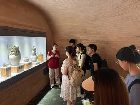 第六天,实践团队前往本次实践的最后一站——杭州南宋官窑博物馆。该馆以南宋官窑遗址为基础,具有深厚的历史文化内涵,是中国第一座陶瓷专题博物馆。“静穆优雅、类如美玉”,官窑青瓷以其端庄大方的造型、精美内蕴的釉色、匠心独运的开片和细致纯熟的工艺,树立起一座青瓷丰碑,引领了整个时代的美学潮流。跟随讲解员的介绍,师生与一件件青瓷器物对话,切身感受青瓷之乡的青风雅韵。