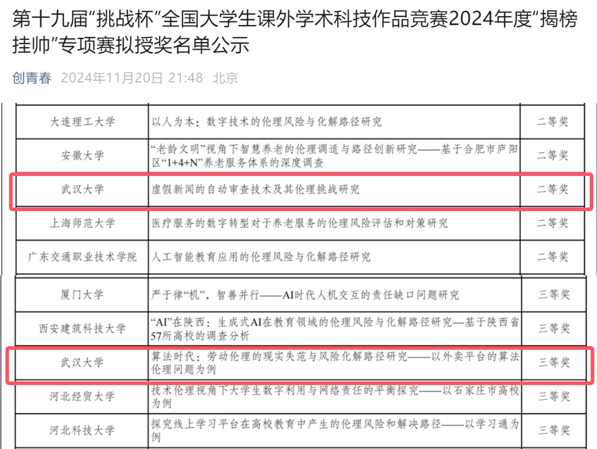 与此同时,陈江进教授参与指导的《算法时代劳动伦理问题研究》项目,通过对外卖平台算法伦理的深入剖析,揭示了算法技术在提升效率的同时对劳动者权益、工作环境及心理健康带来的挑战,并提出了具有前瞻性的风险化解策略,荣获全国三等奖,体现了五楼自拍 对社会热点问题的敏锐捕捉和深刻思考。