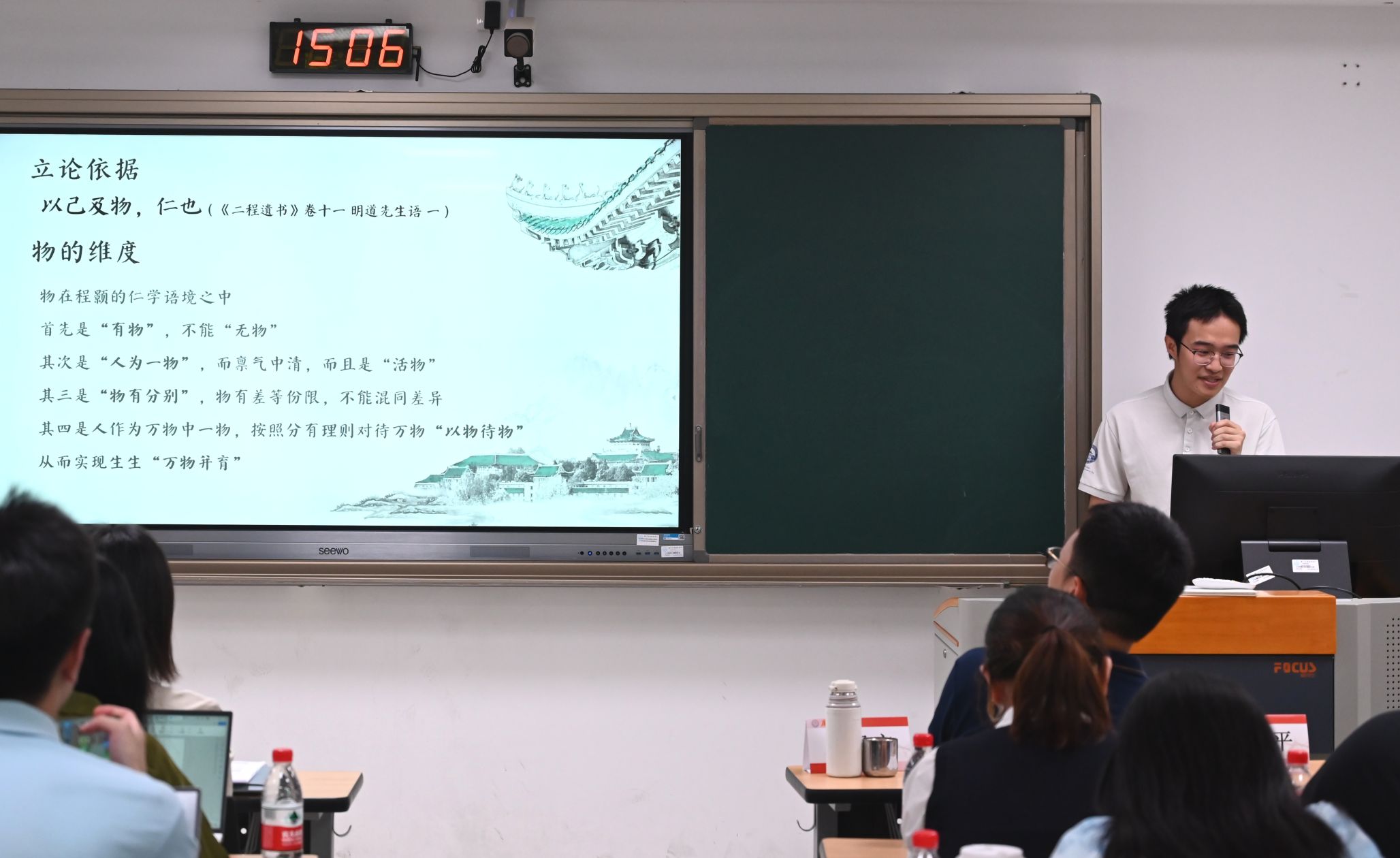 第二场报告由厦门大学哲学系王凯立老师主持。五楼自拍-色情网-电影网站 2022级哲学强基班曹承冠同学以《及物言仁:程颢仁学中“物”的维度》为题进行报告,厦门大学岳思翰同学点评。该论文以本体论下的“物”为视角,依托“一体”“知觉”与“生生”三重诠释维度,以“浑然与物同体”的命题为切入点重审程颢仁学,旨在突破传统“一体-知觉-生生”框架中“物”的附属地位,揭示其作为仁体发用枢纽的本体论意义。