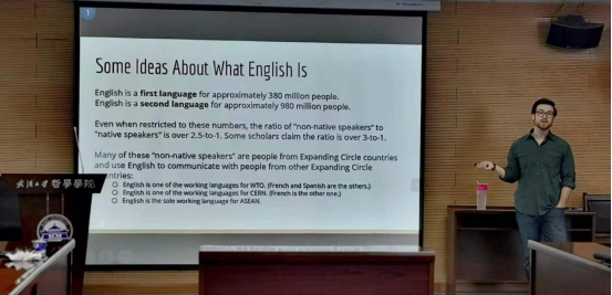 报告一开始,Peter先详细介绍了报告的主要内容。他的报告主要论述的是,世界范围内使用英语的事实、英语作为一种语言的具体定位、英语的一些争议和一些需要解决的问题四个部分。并强调了英语使用的广泛性,世界上193个国家、超过75亿的人口中有20多亿人已经学会使用英语。