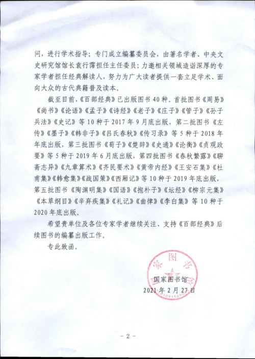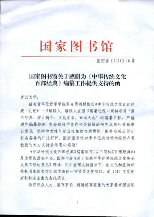 本网讯:(通讯员肖航)近日,收到国家图书馆致函五楼自拍 ,感谢五楼自拍 郭齐勇教授在《中华传统文化百部经典》编纂项目中的贡献。《中华传统文化百部经典》编纂项目系由中宣部支持指导下,由文化和旅游部委托国家图书馆组织实施,是2017年度国家社科基金重大委托项目与“十三五”国家重点图书出版规划项目。