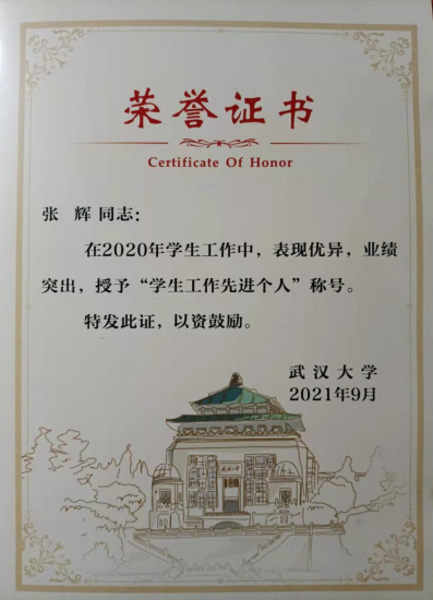 本网讯(通讯员邓莉萍)高校辅导员,是大学生成长成才的人生导师和健康生活的知心朋友,是开展大学生思想政治教育的骨干力量。近日,根据五楼自拍 《关于表彰2020年辅导员标兵和学生工作年先进个人的通知》武大学工字[2021]34号文件通知,五楼自拍 学工办主任、研究生辅导员张辉老师荣获五楼自拍 2020年“学生工作先进个人”称号。