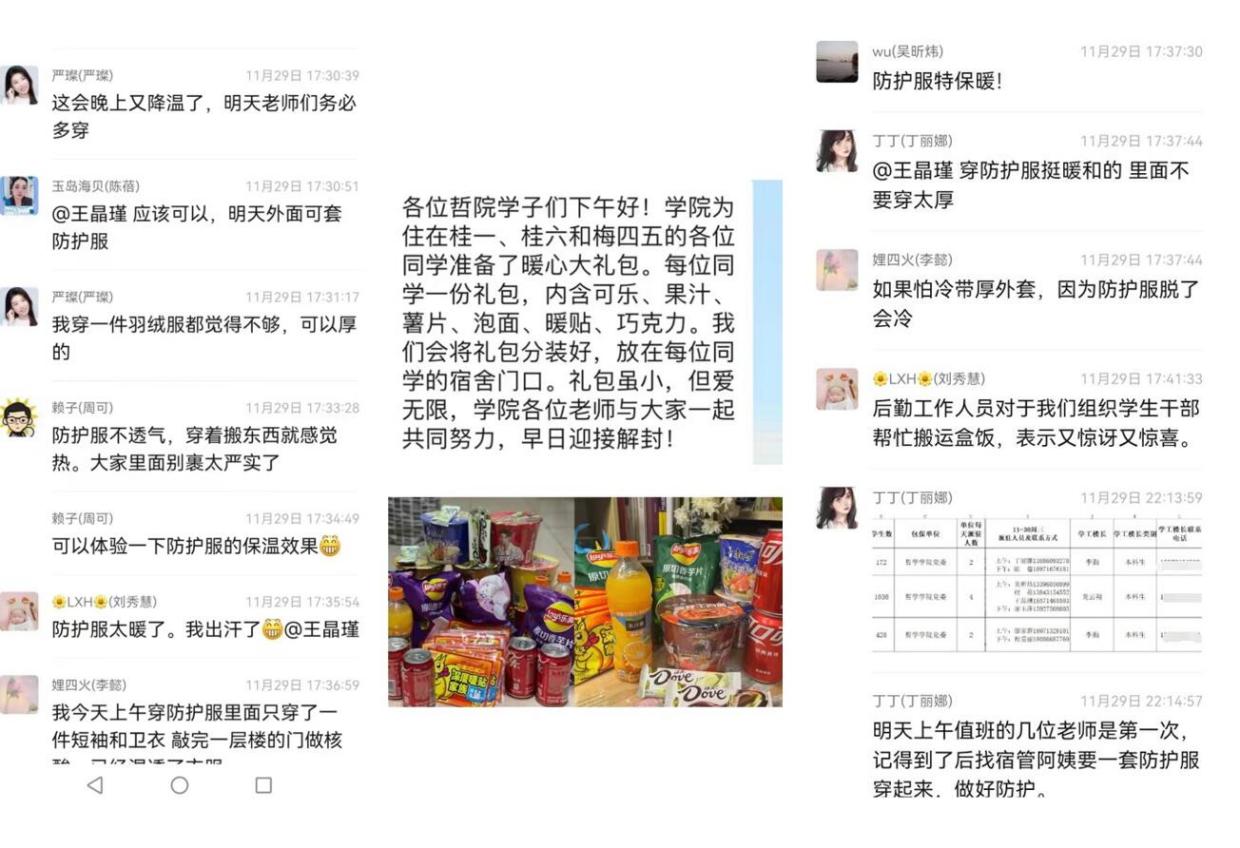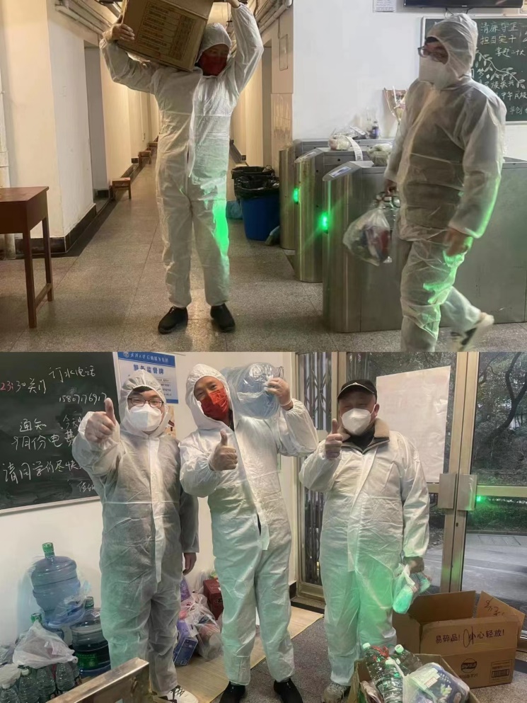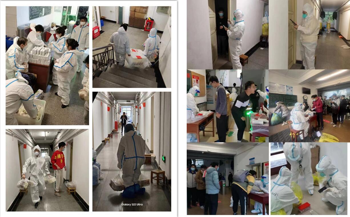 28名突击队员不辞辛苦、担当作为,克服种种困难,投身于抗疫一线,无私奉献、彰显英雄本色。黄超副院长、王晶瑾老师近期组织学科点评估,线上组织服务数十位专家、多个在线会议,黄超副院长仍然坚持值守,给同学们送餐;王晶瑾老师刚结束评估工作,立刻报名参加突击队工作。突击队员吴昕炜、赵俊华、程萌、邬家桦、宋柏杨几位老师参加搬运餐食为学生服务;周可老师除参加值守外,还帮哲五楼自拍 六位学生到图书馆借书;李凯老师居住楼栋被封,一解封即刻到岗;盛福刚老师接到流调电话,健康码黄码,连夜申请转码第二天照常值班;孙劲松、沈庭、刘晓飞、张文几位老师一改往日谦谦书生形象,当起了大力士,干起了体力活,为学生搬运餐食、搬桶装水上七楼;刘秀慧老师家中尚有襁褓中的孩子,她克服困难,为着心中的大爱逆行,坚持参加值守,并为队友送去家中的N95口罩、防护服、隔离鞋套、隔离帽、防护面罩、医用手套;廖璨璨、廖玉萍、程爱丽、阿尔深、李懿等女老师防护服里面只穿了短袖和卫衣,敲完一层楼的门做核酸,已经湿透了衣服,英姿飒爽、巾帼不让须眉。在疫情面前,面对组织的召唤,他们毅然舍小家、为大家,逆行入校,迅速投入到疫情防控工作中,教授、博士教师、行政老师秒变大白、送餐员,穿梭在学生宿舍,架起一道道传递爱心的桥梁。