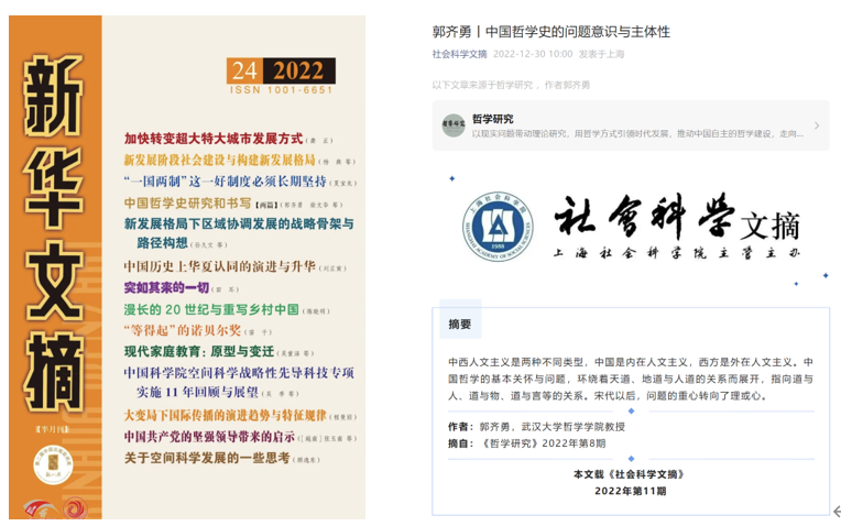郭齐勇教授论文被《新华文摘》《社会科学文摘》转载