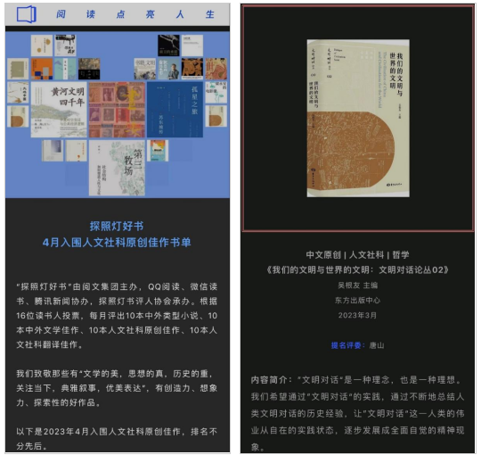 “探照灯好书”由阅文集团主办,QQ阅读、微信读书、腾讯新闻协办,探照灯书评人协会承办。“书榜”致敬那些有“文学的美,思想的真,历史的重,关注当下,典雅叙事,优美表达”,有创造力、想象力、探索性的好作品;“好书榜”根据16位读书人投票每月评出10本中外类型小说、10本中外文学佳作、10本人文社科原创佳作、10本人文社科翻译佳作。《文明对话论丛02:我们的文明与世界的文明》本次入选“人文社科原创佳作榜”。