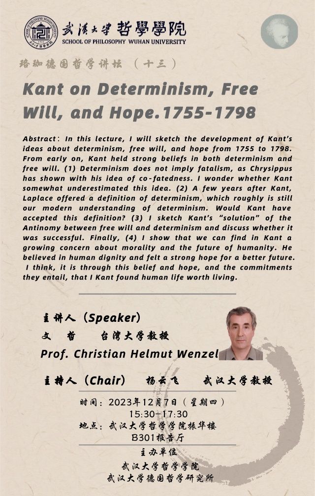【12月7日】珞珈德国哲学讲坛第13讲 ▏ Kant on Determinism,Free Will,and Hope.1755-1798
