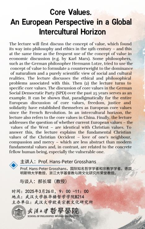 摘要:The lecture will first discuss the concept of value, which found its way into philosophy and ethics in the 19th century – and this at the same time as the frequent use of the concept of value in economic discussion (e.g. by Karl Marx). Some philosophers, such as the German philosopher Hermann Lotze, tried to use the concept of value to formulate a counterweight to the dominance of naturalism and a purely scientific view of social and cultural realities. The lecture discusses the ethical and philosophical problems associated with this. Then (2) the lecture turns to specific core values. The discussion of core values in the German Social Democratic Party (SPD) over the past 25 years serves as an example. It can be shown that, paradigmatically for the entire European discussion of core values, freedom, justice and solidarity have established themselves as European core values since the French Revolution. In an intercultural horizon, the lecture also refers to the core values in China. Finally, the lecture addresses the question of whether current European values – the values of the West – are identical with Christian values. To answer this, the lecture explains the fundamental Christian values of the Christian Occident – love of one's neighbour, compassion and mercy – which are less abstract than modern fundamental values and, in contrast, are related to the concrete fellow human being, especially the vulnerable one.