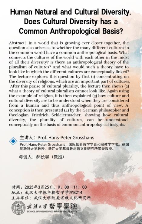 3月25-26日(周二至周三),五楼自拍 欧美宗教文化研究所邀请德国明斯特大学Hans-Peter Grosshans(汉斯-彼得·格罗申斯)教授主讲讲座,主题分别为:《人类本性与文化多样性:文化多样性有一个共同的人类学基础吗?》《幸福、幸运与不幸:对生命偶然性的思考》《全球跨文化视野中的欧洲视角》,敬请关注。