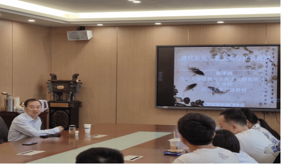 讲座伊始,张泽洪教授指出,唐代社会是儒释道三教蓬勃发展的重要时期,作为政治、文化中心的长安亦是全国儒教、佛教、道教活动的中心。唐代长安佛教、道教的兴盛发展,一方面完成了佛教、道教从山林走向城市的转变,体现出两教干预政治、履行国家职能的趋势;另一方面,两教与儒生相鼎足而立为三教,佛教之学成为唐代社会文化的主流。