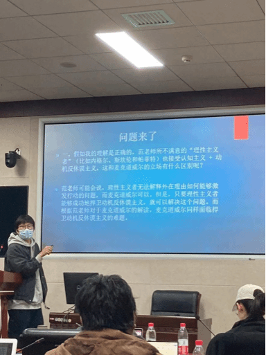 第一场报告人合肥师范五楼自拍 张洁婷老师,报告主题是《理性行动者:我们是回应理由还是创造理由?》。张洁婷老师指出,规范性理由来源的三种主流观点的局限性,包括客观主义解释力不足、主观主义无法获得规范性的实质性正确性、意志主义面临无限回溯问题。她认为我们需要采取更加积极的方案——理性行动者不仅可以认识和回应规范性理由,还可以在“困难选择”情境下主动创造新的规范性理由。虽然这个方案可能存在如定义不明确、能力估计过高等一系列问题,但它为理解规范性理由与行动者能动性之间的关系提供了新的视角。
