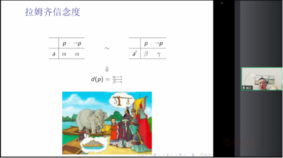 在讲座的第二部分,熊卫教授深入浅出地介绍了拉姆齐主观概率理论背后的深刻洞见。主观概率,或者说个体对某个命题的信念度,可以通过提议一个打赌并由其在赌局中的偏好来显示。熊卫教授形象地将其比喻为“曹冲称象”。具体而言,给定一个行动a’,其在状态p下的效用是β,在状态非p下的效用是γ,则对于某个体而言,假设有行动a使得该行动在p和非p下的效用相等,则使得效用相等的值α依赖于该个体对p的信念度,如果我们知道了α的值,就可以通过求解方程解得其对p得信念度。可以证明,在拉姆齐公理下,信念度函数满足概率论公理,因此可以看成是对概率的一种解释,只不过这种概率是主观的(私人的),表征个体对命题的置信程度,故称之为“主观概率”。