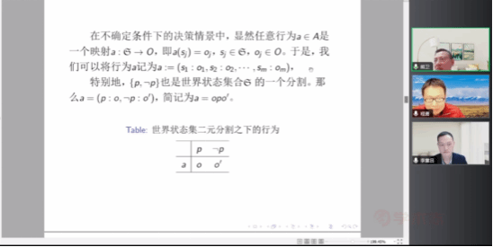 评论环节,李章吕教授对熊卫教授讲座的内容作了简明扼要的总结,并强调了理性选择理论的现实意义:有理性的人如何在不确定情形下作出合理的决策。另外,李章吕教授就形式化事件状态的技术问题与熊卫教授作了深入的交流。