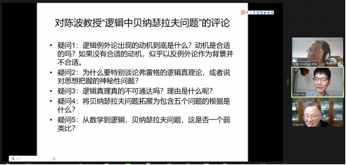 在评议环节,徐敏教授总结了陈波讲演的内容,并以一个逻辑学者的身份对他的观点做出评论。徐敏提出了以下五个疑问:(1)逻辑反例外论出现的动机到底是什么?动机是合适的吗?(2)为什么要特别谈论弗雷格的逻辑真理观,或者说提到关于把握思想的神秘性问题?(3)逻辑真理真的不可通达吗?理由是什么呢?(4)将贝纳瑟拉夫问题拓展为到逻辑领域且包含五个问题的根据是什么?(5)把贝纳瑟拉夫问题从数学扩展到逻辑,这是否基于一个弱类比?
