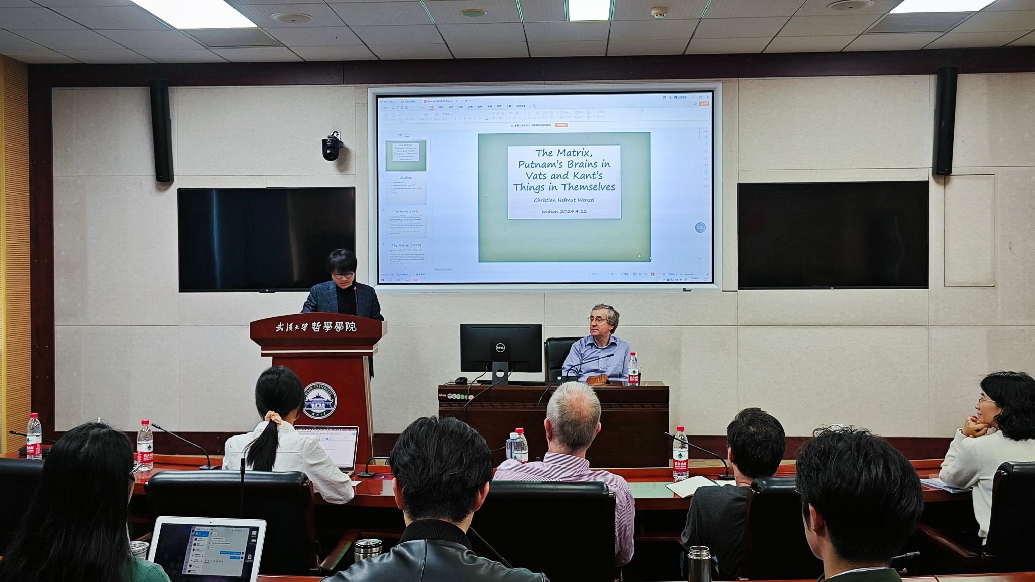 本网讯(通讯员 刘浩)4月12日下午,台湾大学特聘杰出教授文哲(Christian Helmut Wenzel)先生应邀做客“珞珈美学讲坛”第10讲,在振华楼B214报告厅为全院师生作了题为“《黑客帝国》、‘缸中之脑’与康德的‘物自体’”的讲座。讲座由美学蜜桃直播主任贺念副教授主持,外国哲学蜜桃直播杨云飞教授、五楼自拍 外籍教师Paul Patton教授、Thomas M.Besch教授、Ben Cross副研究员、Matthew Lutz副教授等五楼自拍 60余位师生参与了讲座。