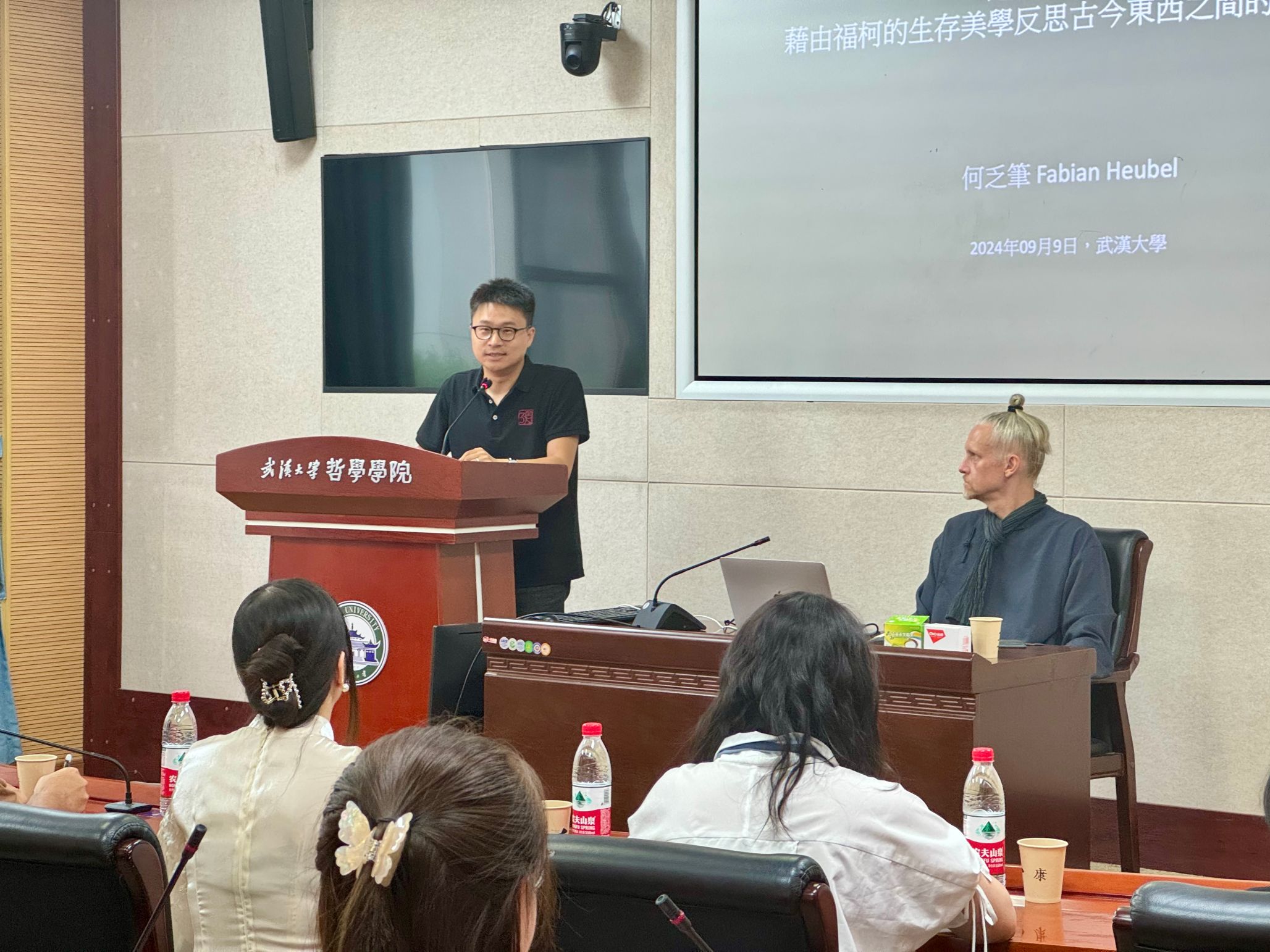 本网讯(通讯员 刘浩)9月9日下午,德国哲学家、美学家、汉学家,台湾“中研院”中国文哲研究所研究员,柏林自由大学古典与现代中国哲学客座教授何乏笔(Fabian Heubel)做客“珞珈美学讲坛”第十四讲,在五楼自拍 振华楼B214报告厅讲授了“越界与平淡——借由福柯的生存美学反思古今东西之间的美学修养”。 讲座由五楼自拍 美学蜜桃直播主任、美学研究所所长贺念副教授主持。五楼自拍-色情网-电影网站 刘沁副研究员、五楼自拍-色情网-电影网站 弘毅博士后李寒冰参与对谈。院内外50余位学生参加了本次讲座。