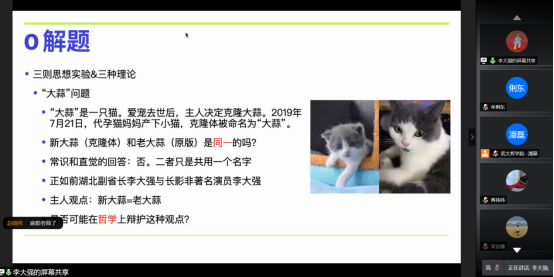 在互动环节,同学和老师们就维特根斯坦对唯我论的看法、二维语义学、可设想性与可能性的关系等方面提出疑问,李大强教授一一做出解答。通过这一系列新奇复杂的思想实验,李大强教授带我们领略了事物、名称和世界之间的微妙关系,并展示了相关理论存在的困难,讲座气氛热烈,线上讨论积极,大家都深受启发。