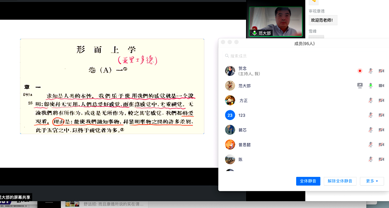 范大邯老师对“审美理念”的这一解读不仅为我们理解康德美学找到了新的视角,而且为美学新的可能性打开了无限的空间。讲座随后进入评议环节。欧阳霄老师首先对范大邯老师宏大且精深的研究表示敬佩,接着结合自己的研究领域提出三个问题:1.原型与摹本之分是否过于柏拉图主义,并且柏拉图的原型是理念,是变动不居的,如何可以与这次讲座中新的解读相容?;2.康德是否过分强调自然美和艺术美,而忽略了日常生活中更广泛的感性之美?;3.康德是否过分强调视觉经验而忽略了其它感官体验?王咏诗老师对本讲座所体现的扎实功底和创新性表达赞赏,并从康德哲学入手提出了三个问题:1,虽然范老师竭力凸显美学的独立性,但应该怎么理解康德讲“美是德性-善的象征”?;2,康德在第一批判中讲到了“先验观念论”和“经验实在论”,这二者的区分是否在康德的美学中也同样适用?;3,从第一批判到第三批判,想象力在康德体系中的位置是否有了变化?范大邯老师感谢这些问题给他带来的启发,并结合康德文本,作了细致的回应。范大邯老师另外也对同学们提出的诸多问题给予了精彩回答。