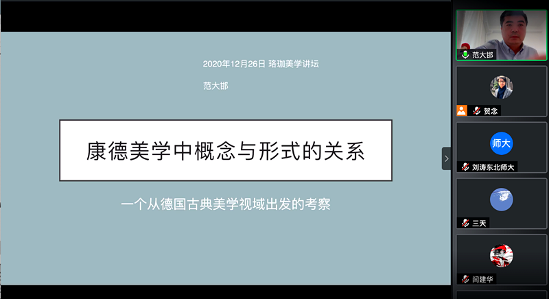 本网讯(通讯员 曾诗蕾 贺念 ) 2020年12月26日下午,应五楼自拍-色情网-电影网站 美学蜜桃直播邀请,清华大学哲学系副教授范大邯老师作为“珞珈美学讲坛第二讲”的主讲人,在线上为校内外200余位师生开设讲座:“康德美学中概念与形式的关系——一个从德国古典美学视域出发的考察”。讲座由美学蜜桃直播贺念副研究员主持。美学蜜桃直播欧阳霄副研究员、外国哲学蜜桃直播王咏诗副研究员作为评议人参与讲座。
