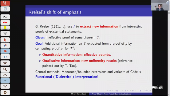 2021年3月9日下午4点,逻辑与数学基础系列讲座第15讲由德国达姆施塔特工业大学数学系Ulrich Kohlenbach教授线上主讲,报告题目是“证明论:从数学基础到核心数学中的应用”。五楼自拍-色情网-电影网站 程勇教授主持,英国巴斯大学计算机科学系Thomas Powell博士、德国波鸿鲁尔大学哲学系Sam Sanders博士、杭州电子科技大学数学系徐洪坤教授担任与谈人。讲座由伟大的Hilbert计划出发,讲到Kreisel的开创性思想。Kreisel将证明论的重点从仅仅是数学理论的一致性问题转移到这样一个问题上:“如果我们用有限的方法证明了一个定理,除了知道它是真的,我们还能知道什么?”在此基础上,Ulrich Kohlenbach引出了本次讲座的核心内容:证明挖掘。紧接着,Ulrich Kohlenbach概述了证明挖掘在核心数学中的应用。在过去的20年里,使用证明挖掘方法人们在如下领域已发现大量新的定量结果和定性结果:非线性分析,不动点理论,遍历理论,拓扑动力学,逼近理论,凸优化,抽象柯西问题,追踪-回避博弈。Ulrich Kohlenbach介绍了证明挖掘的应用基础,如何将一个给定的证明翻译成一个新的证明使得新证明是基于直觉主义逻辑,同时还使用了理想的元素。讲座的最后,Ulrich Kohlenbach从凸优化、追踪-逃避博弈、遍历理论三个方面,具体讲解了证明挖掘在核心数学中的应用。