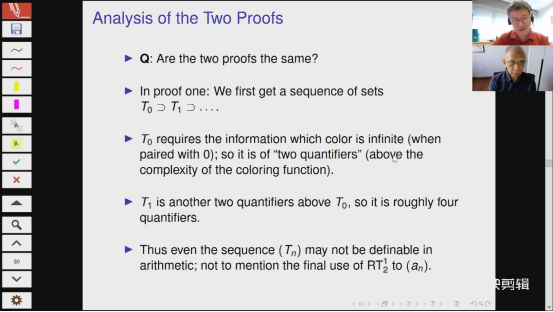 2021年2月26日下午4点,逻辑与数学基础系列讲座第14讲由新加坡国立大学数学系杨跃教授线上主讲,报告题目是:“Ramsey定理,反推数学及数学基础”。新加坡国立大学讲座教授、新加坡国家科五楼自拍 庄志达院士主持。此讲座的内容大致可以分为三个部分。第一个部分是预备知识。杨跃教授从可计算性角度出发分别引入可计算集和一阶算术可定义集。在反推数学中,这两类集合分别对应递归论中RCA0和ACA0两个算术子系统。讲座的第二部分是证明反推数学中的几个定理。在证明Ramsey定理的过程中,杨跃教授运用了两种方法,一种通过不断提纯尾巴,另一种运用了二叉树的思想。讲座的第三部分是对数学哲学的讨论,主要涉及三个观察。第一个观察是绝对混沌是不可能的。第二个观察是数学问题的解比数学问题本身层次更高。第三个观察是秩序是真实存在的,我们要不断提升自己才能观察到这些秩序。
