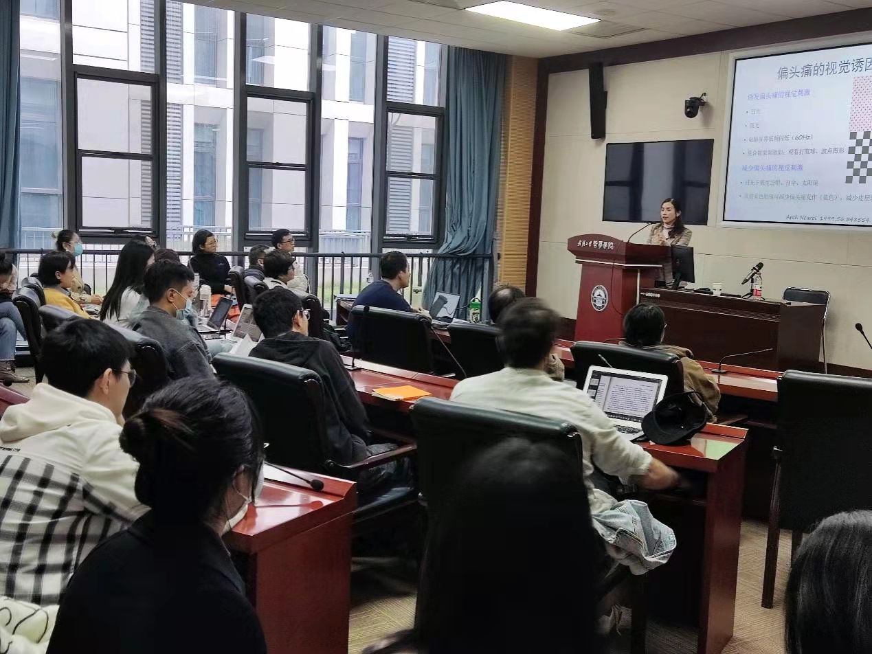 接着,肖哲曼教授介绍了偏头痛,该病具有高发病率,高致残性,诊出率低,投入不足,亟待帮助等特点。关于偏头痛的原因解释有很多,主要包括神经学说和血管学说,两种理论大致博弈了100年,后来两种理论被整合为三叉神经血管学说,又迎来百花齐放的40年。偏头痛亦存在视觉诱因,包括日光、强光、电脑屏幕低频闪烁(60Hz)、还有一些复合视觉刺激。减少偏头痛的视觉刺激有日光下戴宽边帽、打伞、太阳镜、佩戴有色眼镜可减少偏头痛发作(蓝色),减少皮层激活。有趣的是,在医院工作人员中头痛患病率非常高,是影响医务人员工作效率的相关因素。